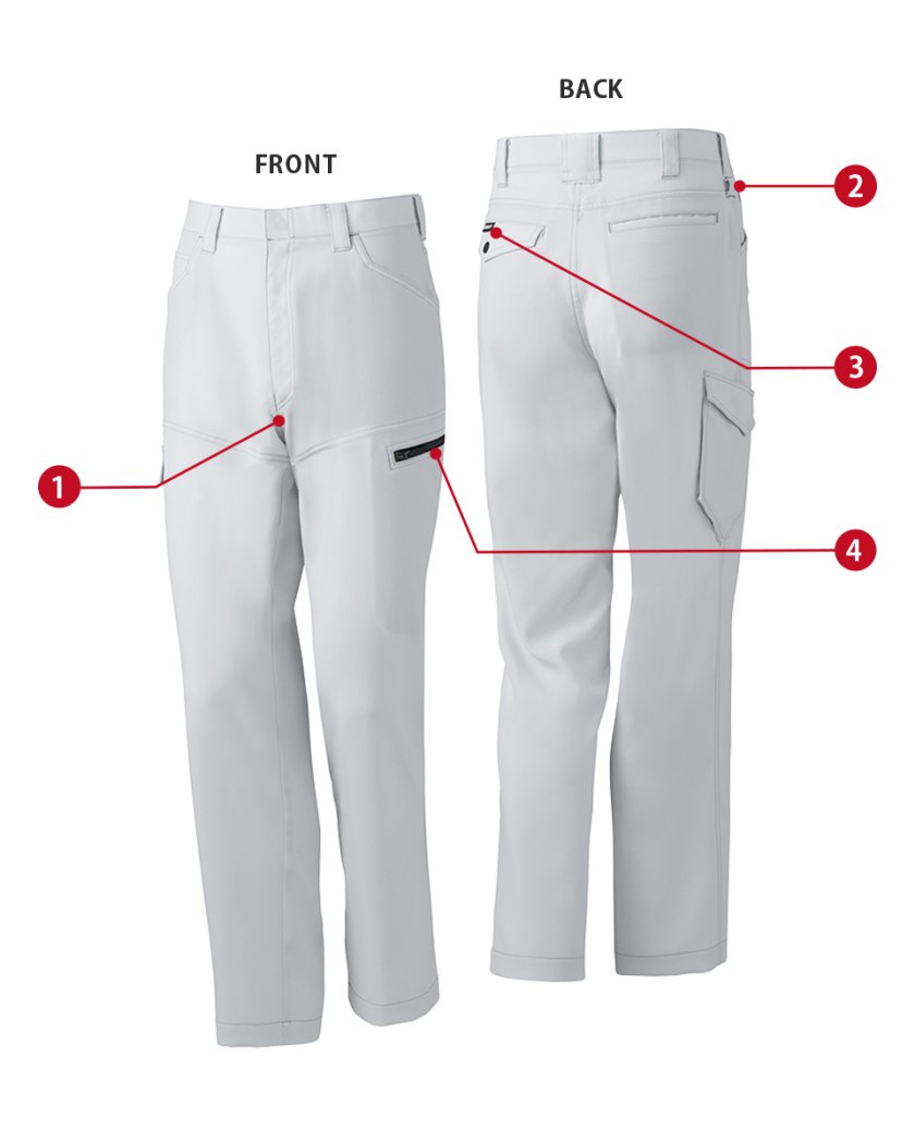 ソフトな風合いとストレッチ性が魅力の裏綿素材。 フルハーネスを着用してもポケットがベルトに隠れにくいデザイン仕様 配色部分は高強度コーディラ®ファブリック使用