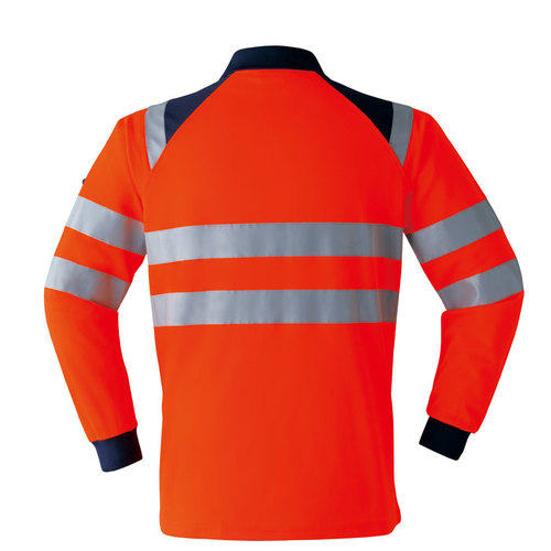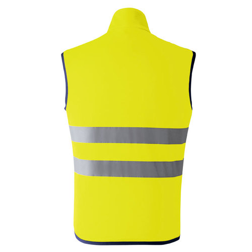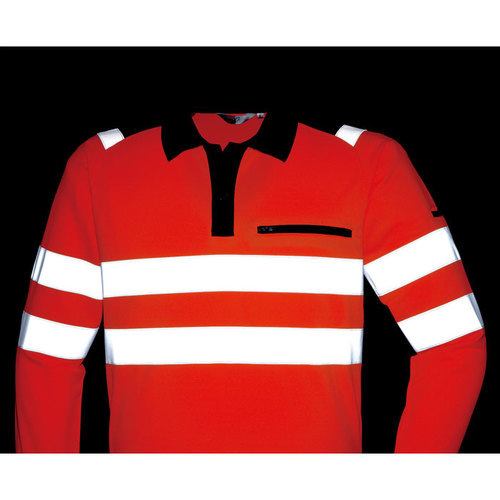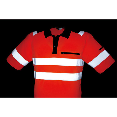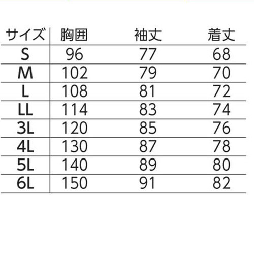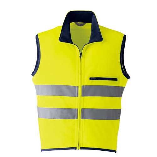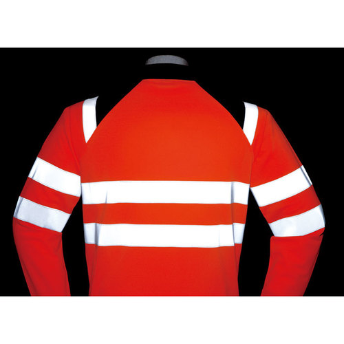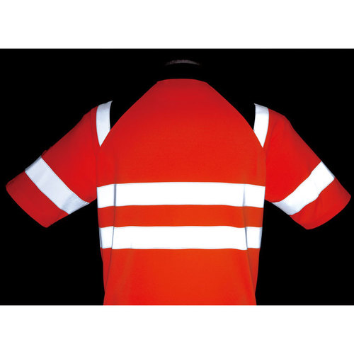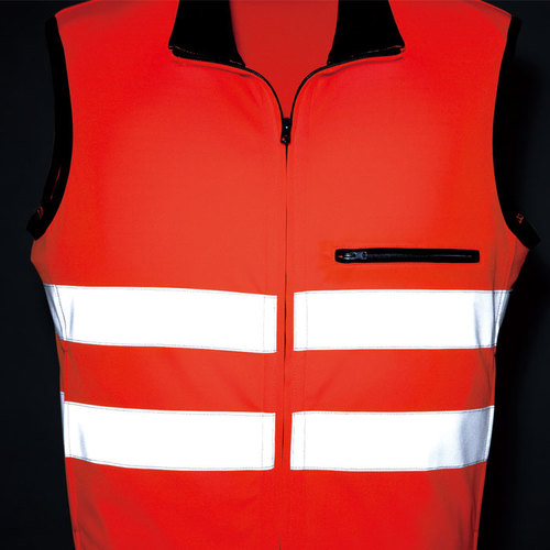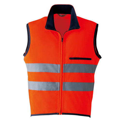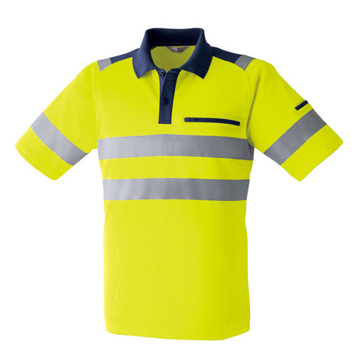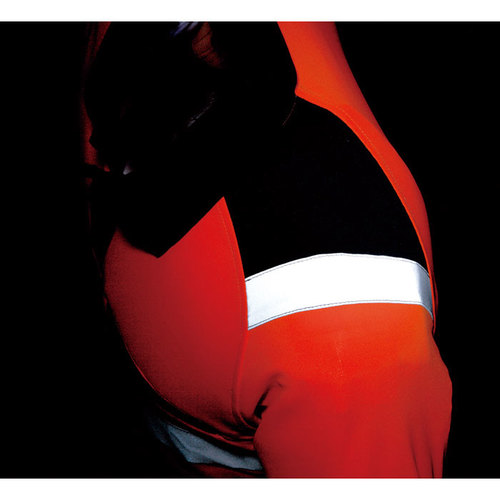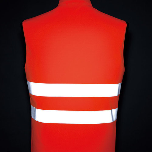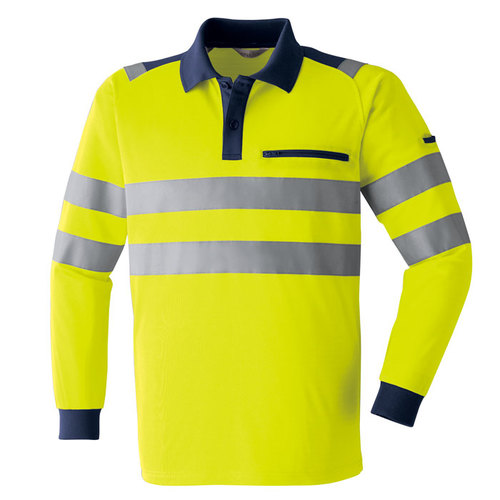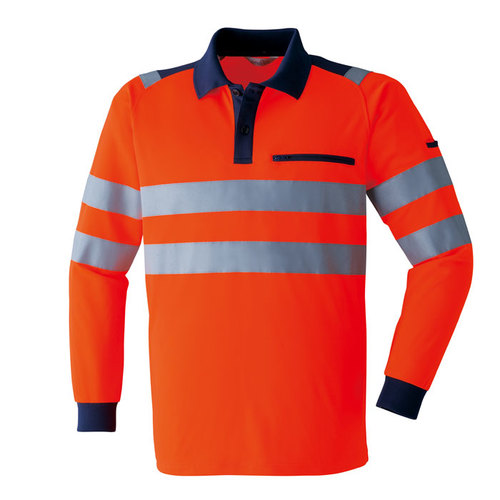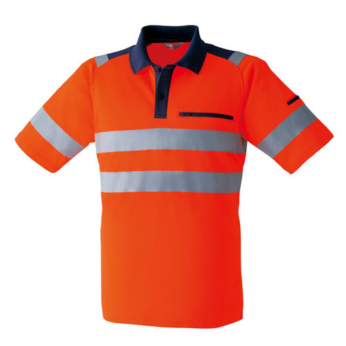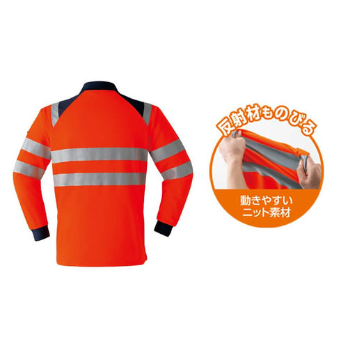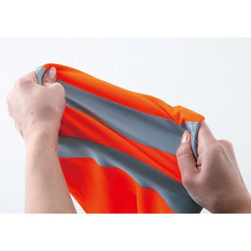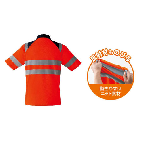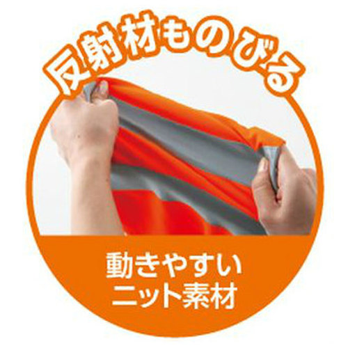 JIS規格の厳しい基準に合格した素材(ポリエステル100%)と50mm巾の再帰性反射材(肩部は30mm巾)を使用し360°の視認性を実現。 伸縮性反射材使用を使用している為、より動きやすい。 色展開は、蛍光イエロー・蛍光オレンジの2色。サイズはS~6Lまで展開。