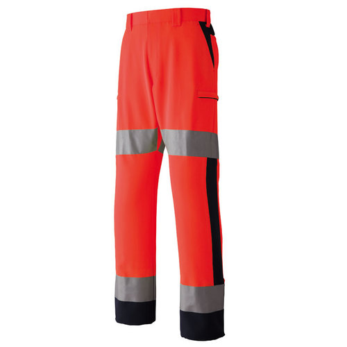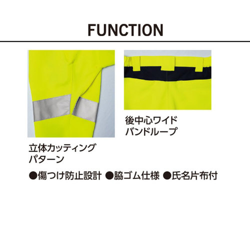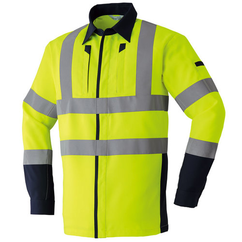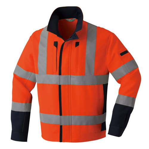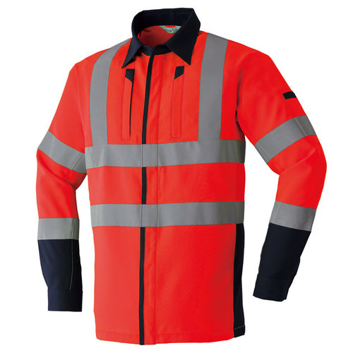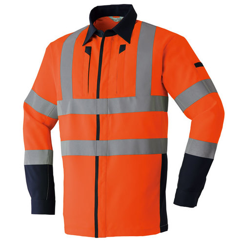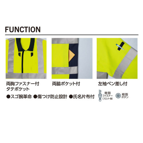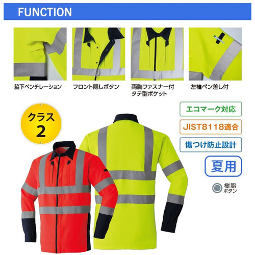 素材特長:高堅牢度加工、帯電防止素材、高視認性(JIST8127適合/ISO20471適合)、高輝度ガラスビーズ反射材(反射テープ幅:50mm)
