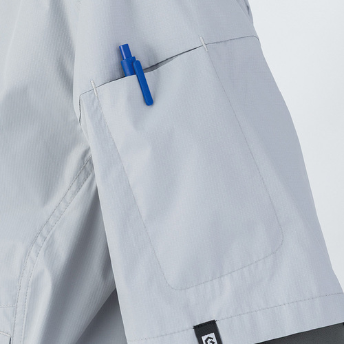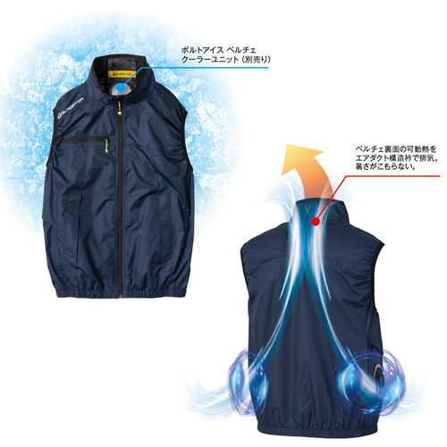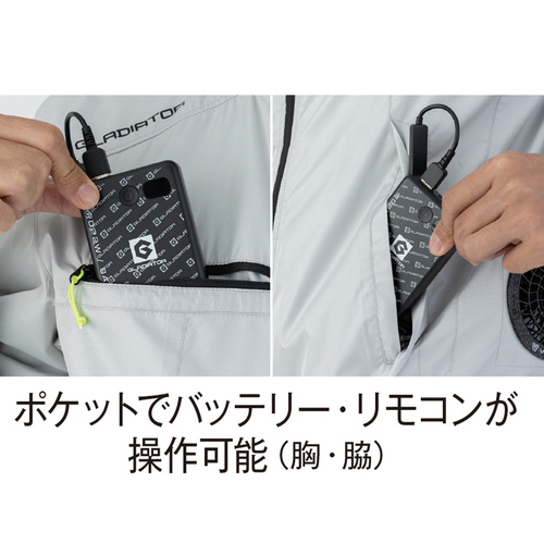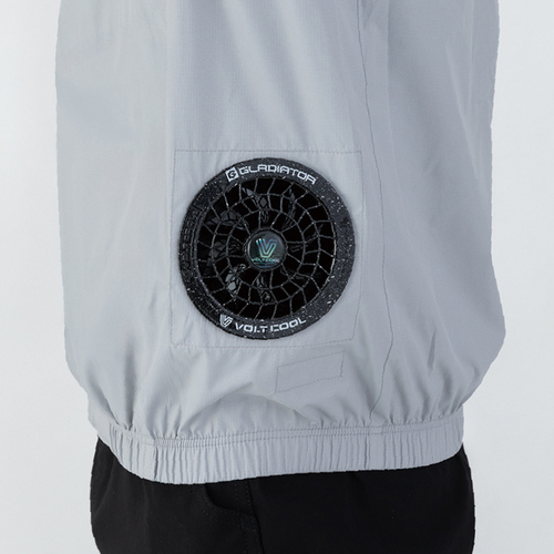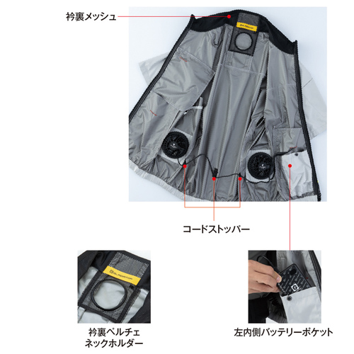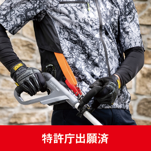 裏アルミコーティングの「日傘遮熱®」でマイナス11度を実現。刈払機肩掛けベルトの取り出し口を装備し、シート着座時でもファンが邪魔にならないサイドファン仕様。