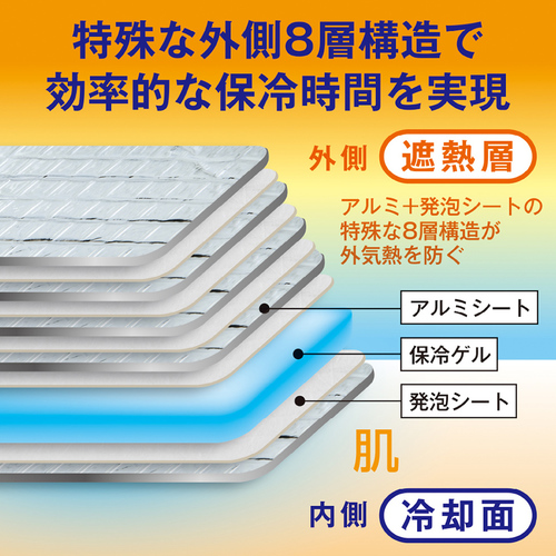 アルミ+発砲シートの特殊8層構造が外気熱を遮断し、長時間の冷却効果の持続を実現。さらに結露を軽減し、衣服も肌も快適に保ちます。