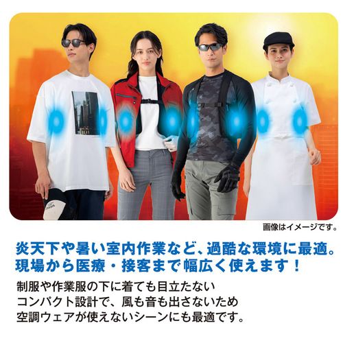 保冷剤(別売り)が身体のラインに沿うポケット設定で脇の違和感0へ。冷却「最強」レベルの冷却面積率と密着度!大容量ポケットで300gの保冷剤がしっかり収まるから、冷却が長く続く。作業服・空調ウェアの下に着ても目立たず、多様なシーンで速攻クールダウン。