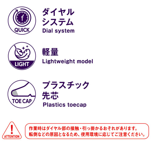 スピード装着可能なサイドダイヤルで瞬時にフィット、簡単かつスピーディな脱ぎ履きを実現。