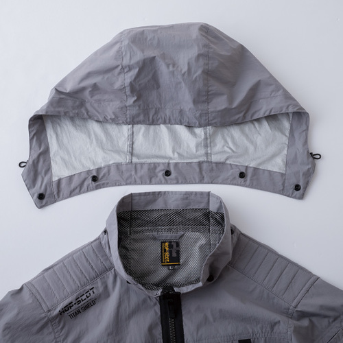 UPF50+の遮熱チタンコーティング素材に、独自のシワ加工を施したTITAN SHIELD™は、酷暑化でも高いパフォーマンスを発揮。遮熱チタンコーティングが熱を反射し、体温上昇を抑制するとともに、UPF50+で紫外線カット。脱着式フードは作業環境に合わせて使い分けが可能で、肩刺し子補強とハイバック仕様により、腕や肩の動きにハーネス使用時の動作も妨げません。過酷な作業環境に対応する機能をフル装備。タフなデザインと快適性を両立した、真夏の過酷な現場でも頼れる一着です。