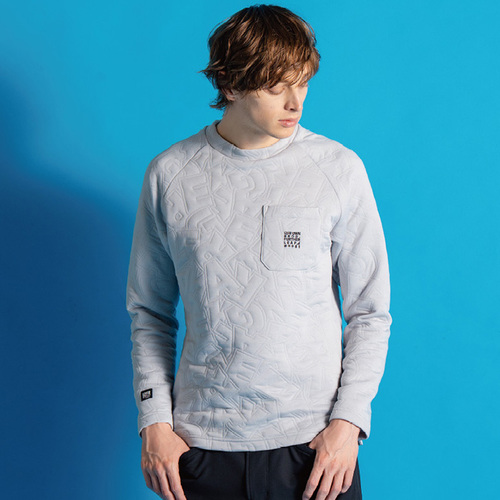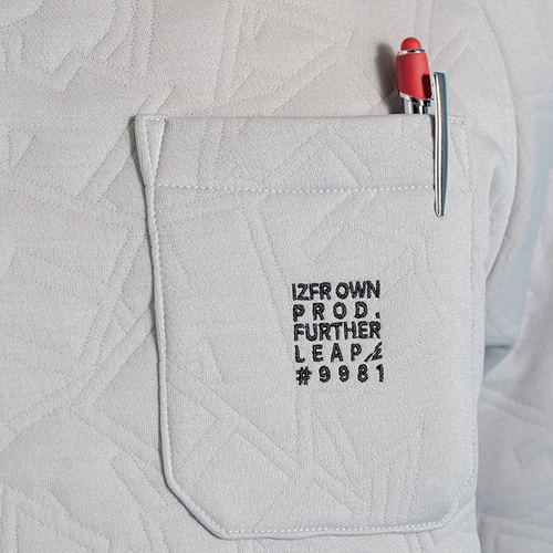 ◆胸ポケットはペンを挿せるやや大きめの設計も、タイポグラフィーなロゴ刺繍を施しデザイン性高いリッチなルックスを両立。