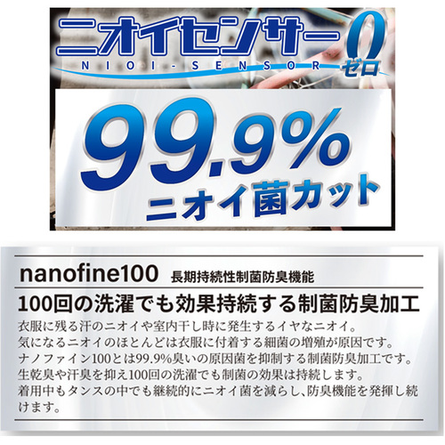 細菌の増殖を抑制する「長期持続性制菌防臭機能ナノファイン100」を使用したジャガード編の長袖アンダーレイヤー。 耐洗濯性が高く制菌機能を長期間持続、汗や部屋干しの臭いを防止。 さらに接触冷感性、ストレッチ性、吸汗速乾性、通気性など、優れた機能を発揮。