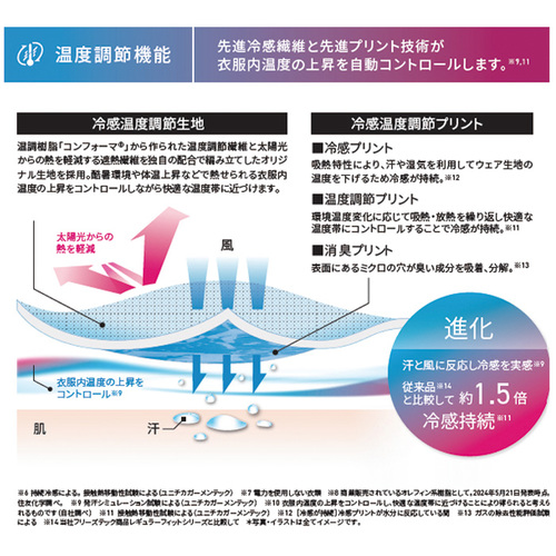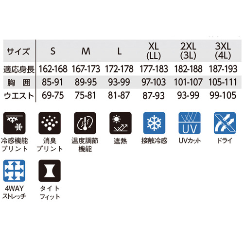 - 冷感機能プリント、消臭プリント、温度調節機能、遮熱、接触冷感、UVカット、ドライ、4WAYストレッチ、タイトフィット
