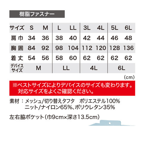 • XEB33001 ジーベック 33001[春夏用]ペルチェ冷却ベストセット(バッテリー付き)のサイズ表